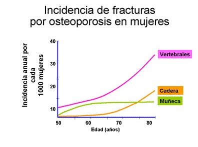Las fracturas más comunes asociadas a la osteoporosis son las de muñeca, columna y cadera. La incidencia de estas fracturas, particularmente cadera y columna se incrementan con la edad, tanto en mujeres como en hombres.